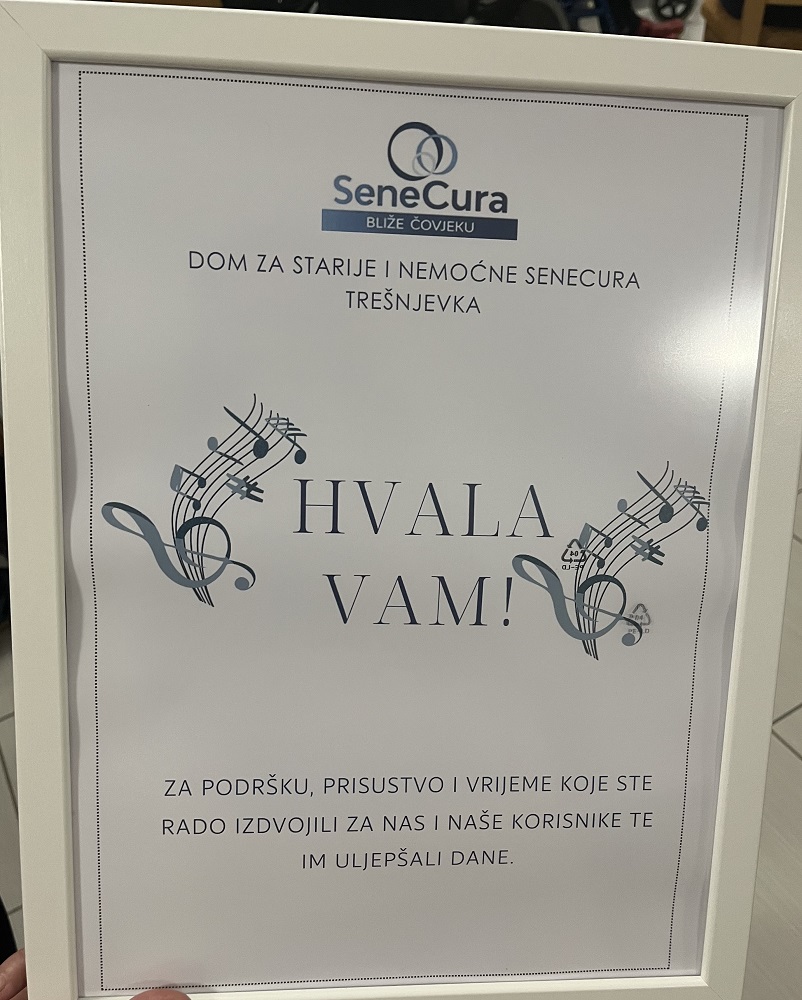 Koncert je bio prekrasan, korisnici su bili oduševljeni. Na kraju su se svi zajedno počastili pićem, jelom i razgovorom. Našim smo gostima pripremili simboličan poklon uz zahvalnicu za vrijeme i trud koje su izdvojili za nas.